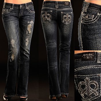 Rock and Roll Cowgirl Heart Peace Sign Design Boot Cut Jeans These juniors low rise jeans feature a dark denim fabric with heavy grinding on the front leg that has a backer fabric to keep the jeans legal in school. A black crystal heart peace design on the back pockets gives it an extra edge. 98% Cotton, 2% Spandex Relaxed fit Low rise Boot cut Hematite stone heart peace sign design on back pockets Distress fray with stones and embroidered stitch on both front legs Keystone belt loop with metal R rivet Old English R dome shank button on coin pocket flap Embroidered R & R logo woven label on back waistband Hand wash, hang to dry 34 inch inseam Style # W0-6281-12