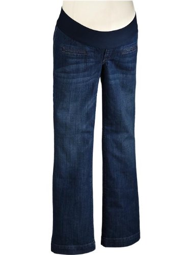Old Navy Stretchy jersey waistband Faux fly Decorative welt pockets in front and back Medium denim wash with subtle whiskering and fading All around elasticized waist for added comfort Sits low on belly Great for the whole nine months Straight through hip and thigh Boot cut leg