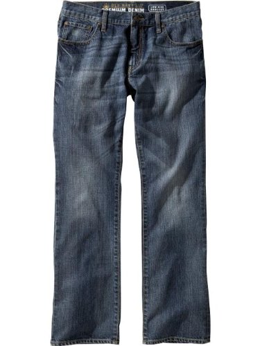 Old Navy Button closure and zip fly Riveted scoop and riveted coin pocket in front; patch pockets in back Nicks, abrasions, whiskering and other distressed details vary by wash Two tone topstitching Tag free, screen print label inside back waist for added comfort and style Sits below waist Straight fit through hip and thigh Slight flare from knee to leg opening Boot cut leg